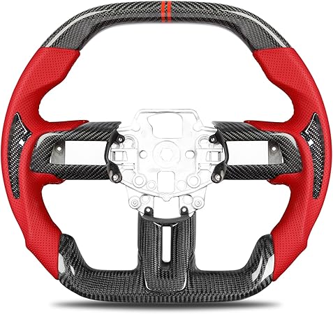Steering Wheel for Mustang 2015-2017 Real 3K Carbon Fiber with Trim Cover Double D-shaped Red Nappa Perforated Leather Grip Hand-stitched for Mustang V6/EcoBoost/GT for Shelby GT350/GT350R